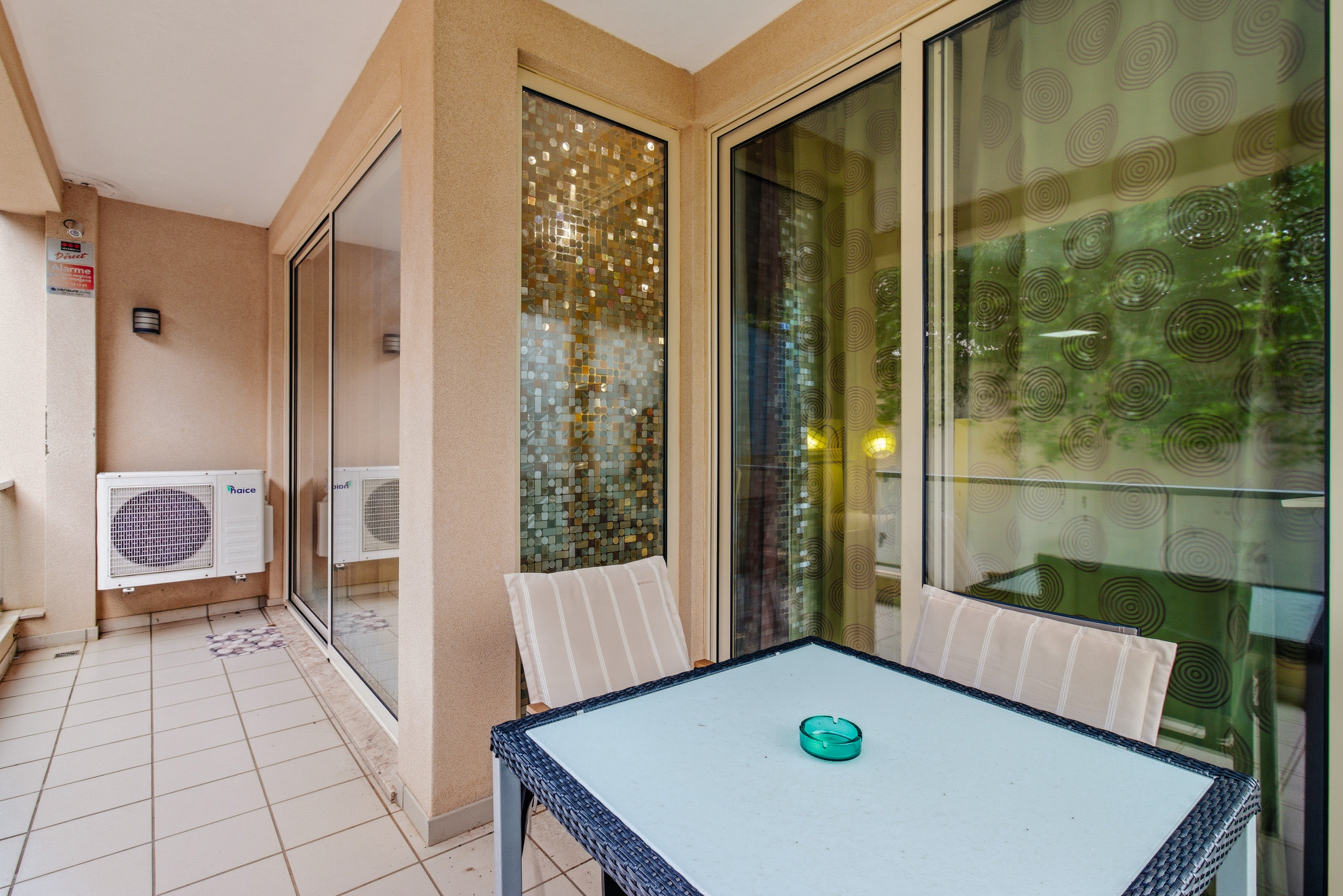 Take advantage of the large balcony, ideal for sipping drinks during warm summer evenings. With air-conditioning to keep you cool and a parking spot in the communal garage, this apartment has everything you need. Plus, enjoy access to a shared pool for those hot days!