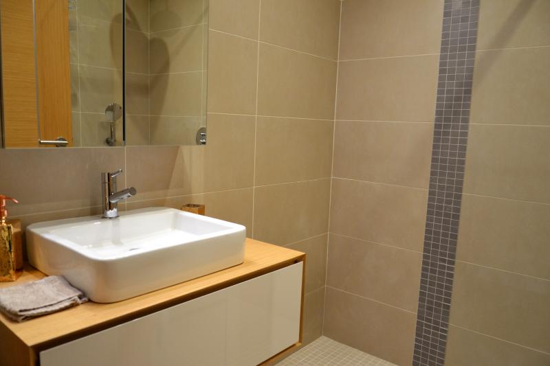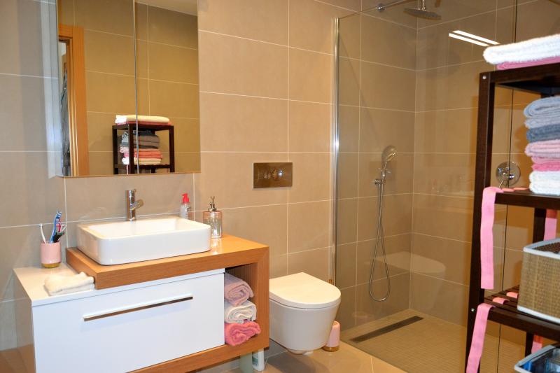 The master bedroom has a king sized bed, and an en-suite with a large walk-in shower. The 2nd bedroom has 2 single beds which can be used as a large double, and adjacent a bathroom with walk-in shower. Both bedrooms have sea views with sliding patio doors leading out onto the balcony and both have ample wardrobe space.