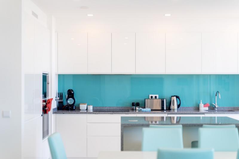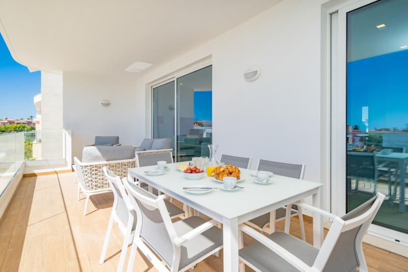 The spacious open plan living and dining room caters for 6 and leads out to the main balcony. This is furnished with a table and chairs, perfect for al fresco dining. There is also a comfortable seating area for relaxing and soaking up the sun.