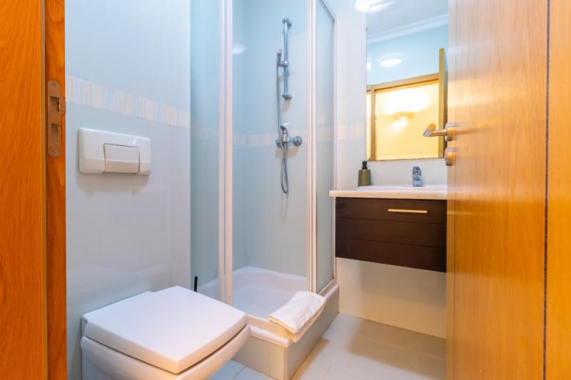 The master bedroom has a king size bed, cupboard space and a safe, spacious en-suite bathroom with a bath, under floor heating and heated towel-rack. The second bedroom has two single beds and cupboard space along with direct access to the large patio. The second bedroom is serviced by a shower room.