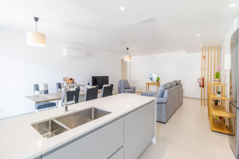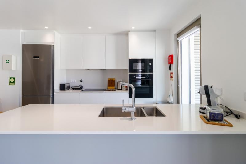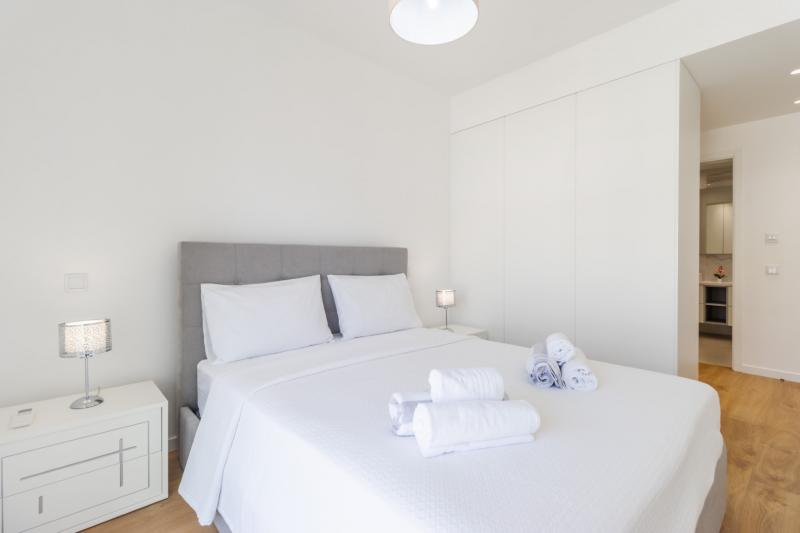 This apartment is designed in a white and bright colour scheme creating a welcoming and inviting atmosphere. The open floor plan seamlessly connects the lounge, dining area and kitchen. Large dining table accommodates up to 6 guests and the comfortable chaise lounge invites to relax while watching a movie. Adjacent to the lounge is a fully equipped kitchen with modern appliances and ample counter space. Whether you’re a culinary enthusiast or a casual cook, you’ll find everything you need to prepare meals with ease.