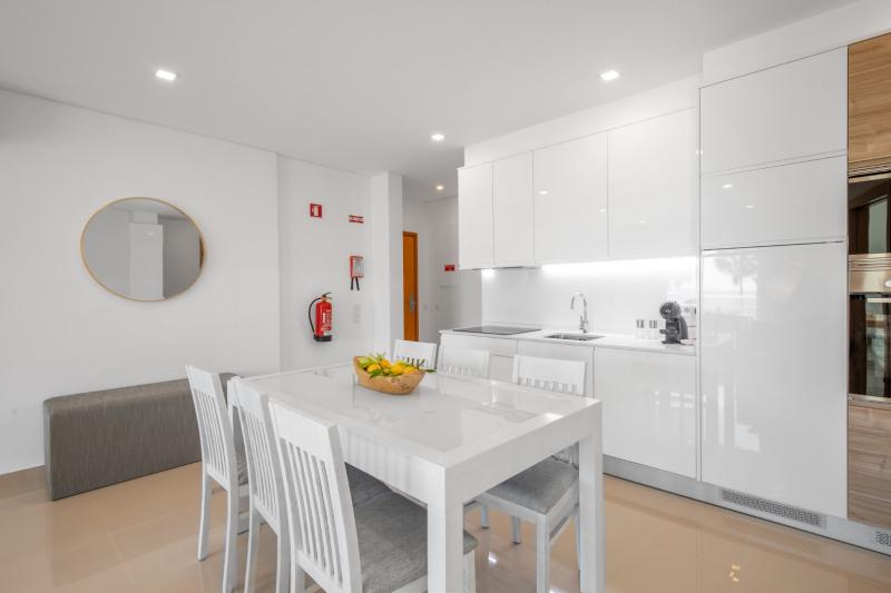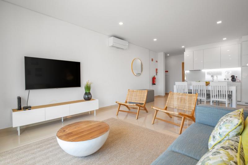 There is a living room with a comfortable sofa and chairs, a smart TV, and access to the balcony. The open-plan kitchen has an induction stove, refrigerator, microwave, oven, freezer, washing machine, dishwasher, dishes/cutlery, kitchen utensils, and coffee machine. From the balcony, you can have your meals looking toward the blue Portuguese ocean