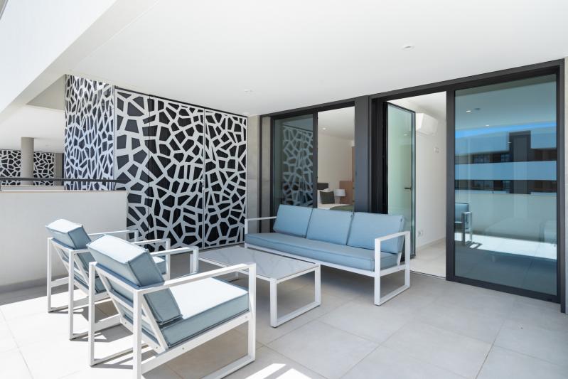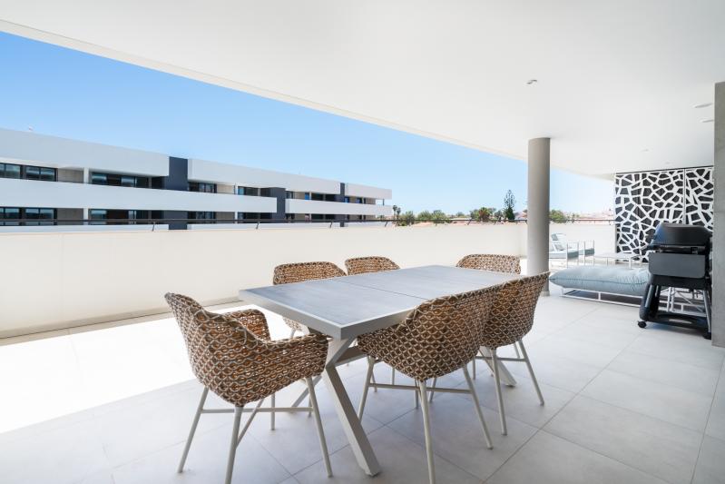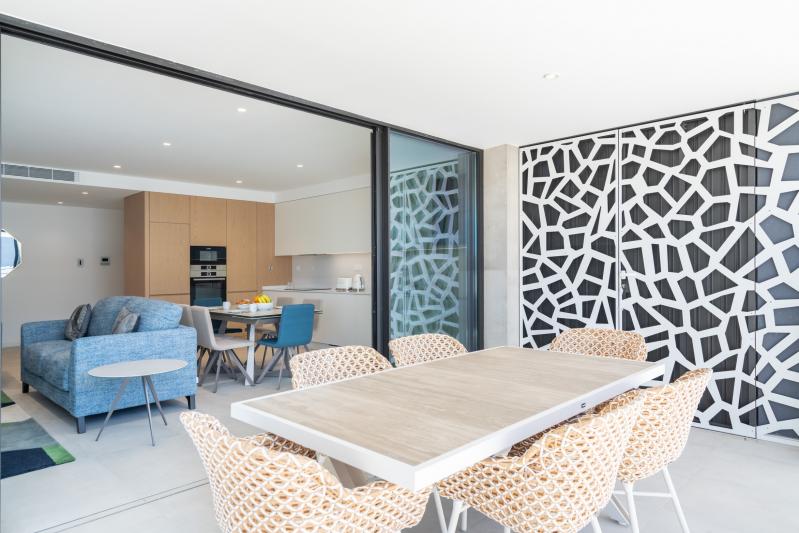 The master bedroom provides a serene escape, boasting a luxurious king-size bed, a walk-in dressing area, and an en-suite bathroom with a large, walk-in shower. The second bedroom, which can be configured as a twin or king-size double, includes a built-in wardrobe and is adjacent to a beautifully appointed family bathroom. Both bedrooms, along with the living area, open onto an expansive southeast-facing balcony with a pool view, where you can enjoy al fresco dining with the provided dining set, electric BBQ, and cozy seating area, perfect for soaking up the sun.
