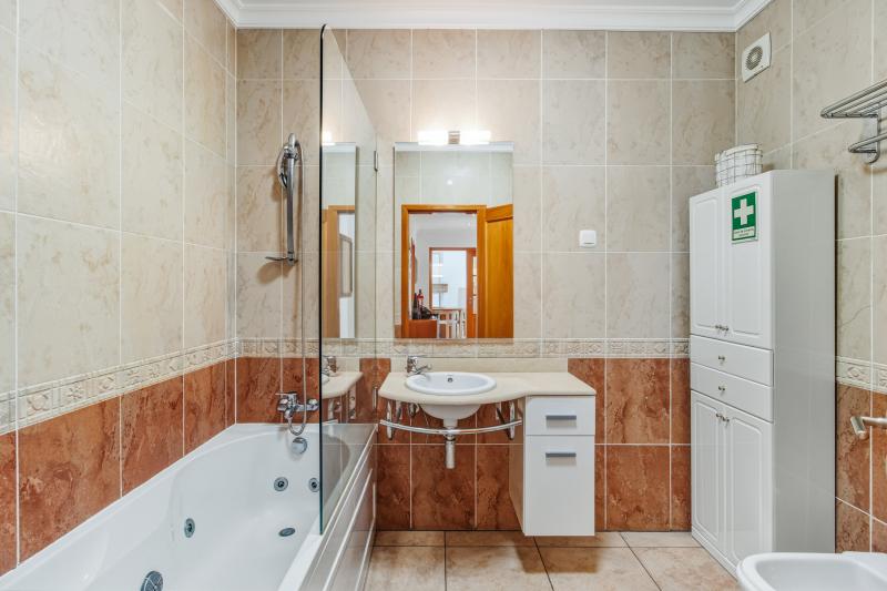 The apartment features a cozy bedroom with a king size bed (2 single beds together), fan and built-in wardrobes, as well as a full bathroom conveniently accessible from the entrance hall. The open-plan living area includes a comfortable sofa-bed (180x200cm), adding the sleeping space for additional 2 people.