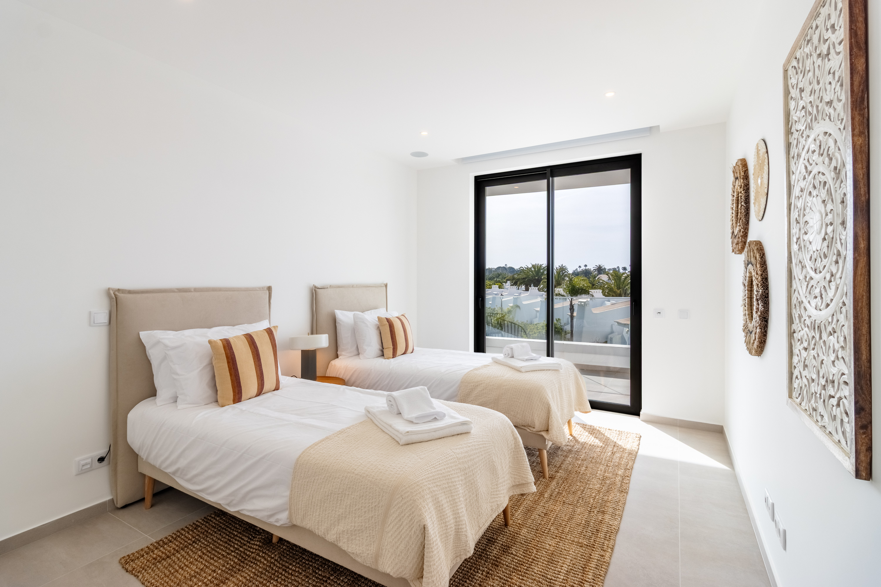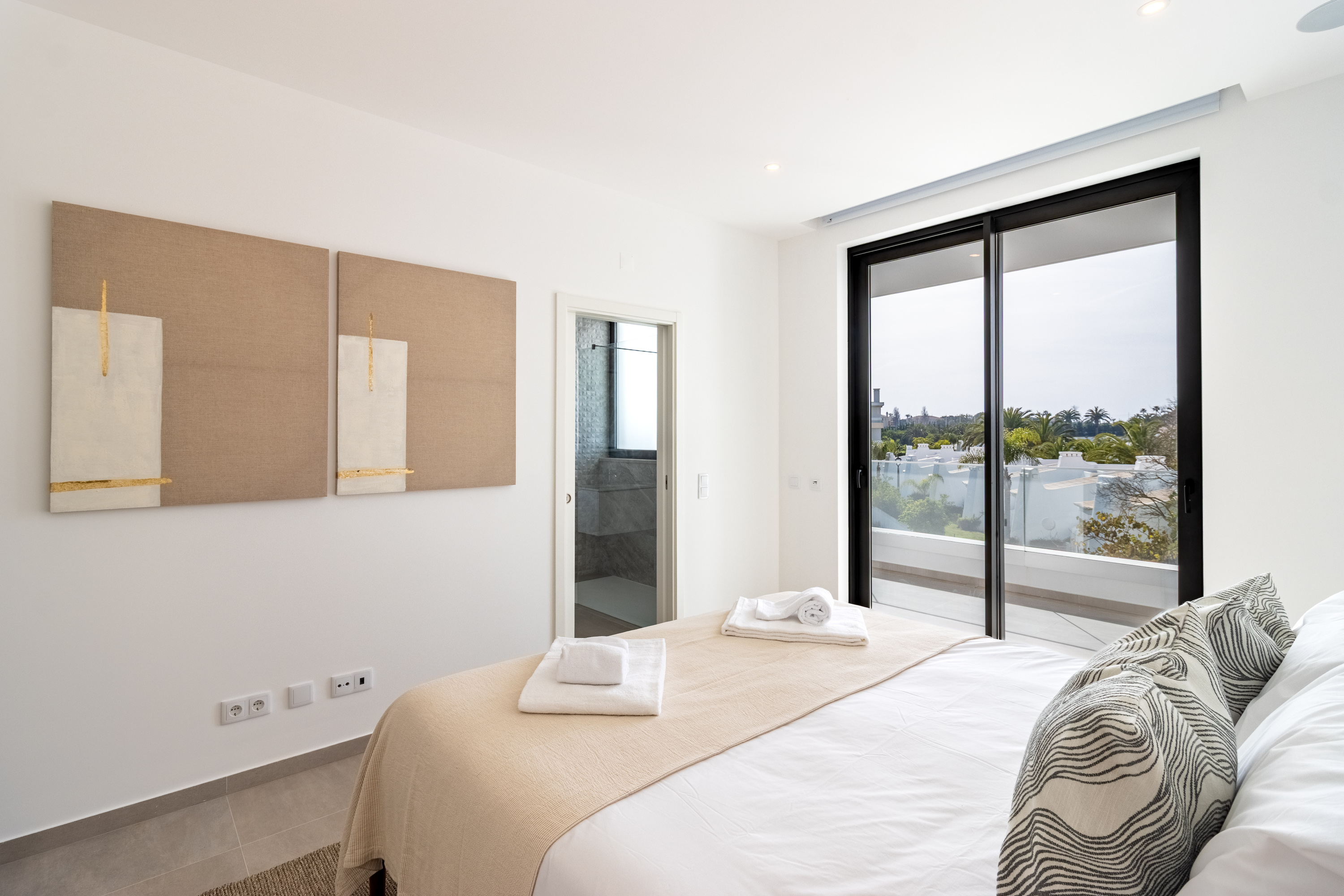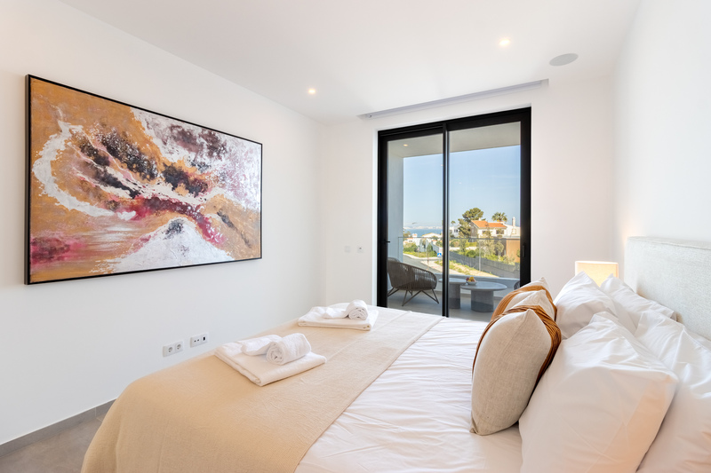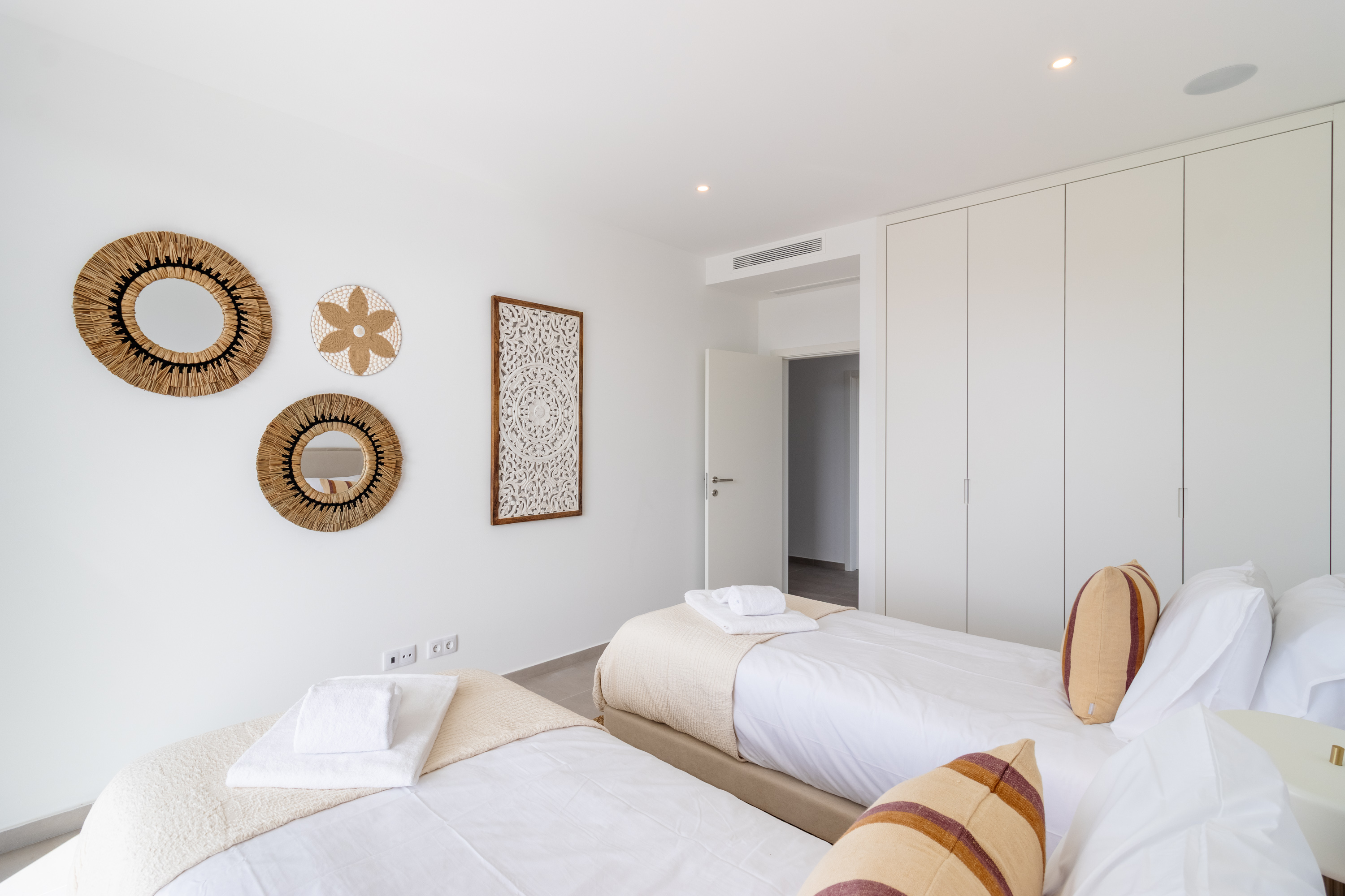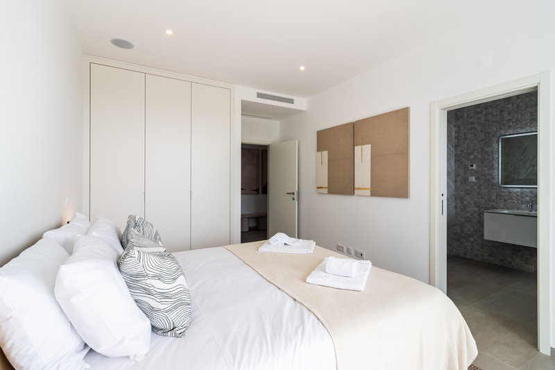 The apartment features three generously sized bedrooms, all designed with comfort and style in mind. The master suite, with a luxurious super king-size bed (180x200cm), enjoys direct access to the west-facing terrace, perfect for quiet evening moments. The second bedroom also offers a super king-size bed (180x200cm), its own private balcony with sea views and morning sun, and an en-suite bathroom. The twin bedroom (2x 90x200cm) is equally spacious and is served by a modern family bathroom.