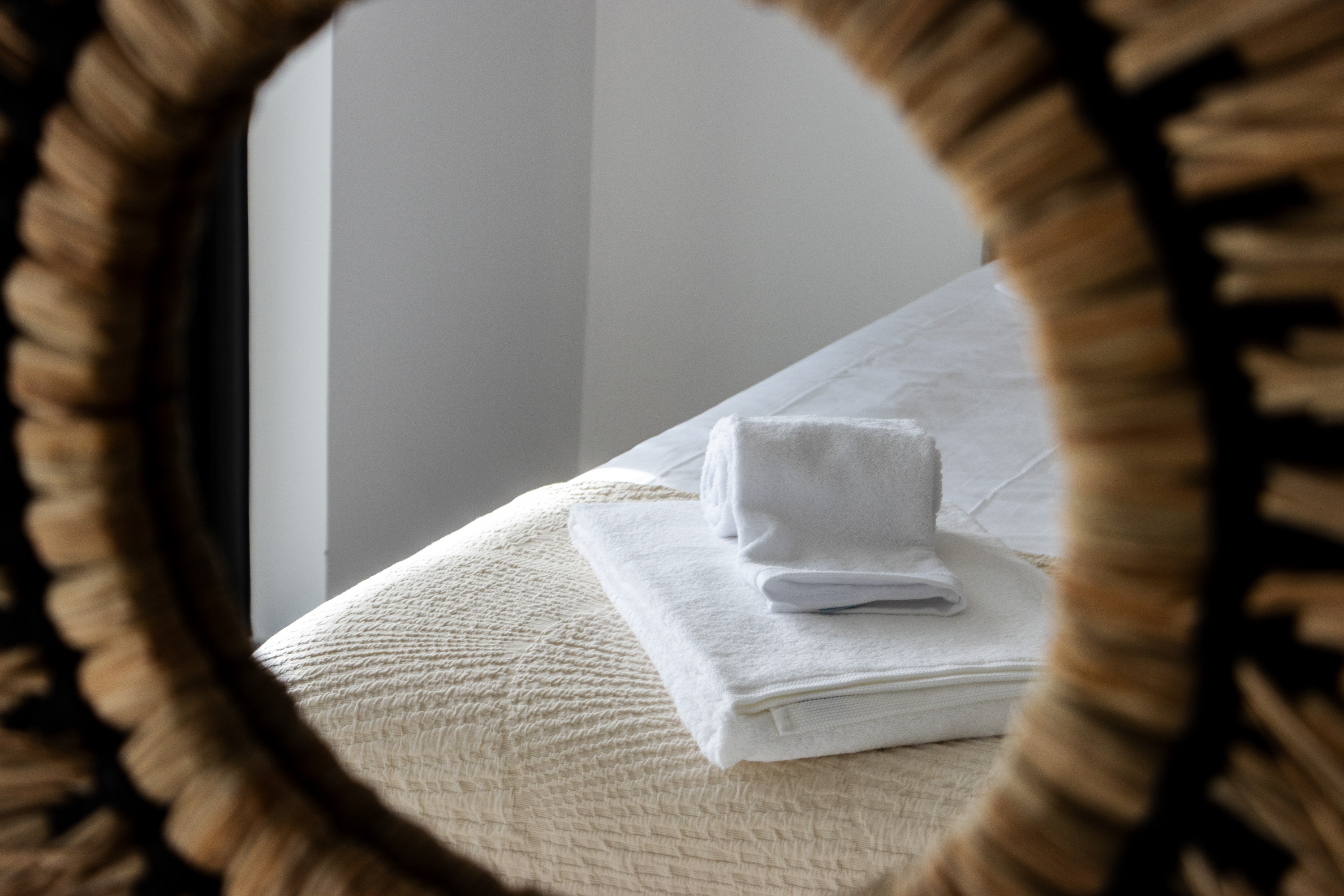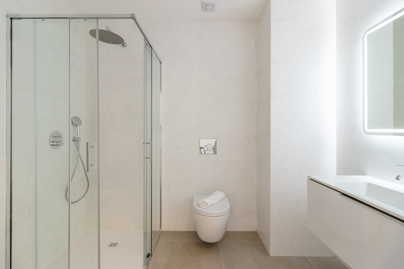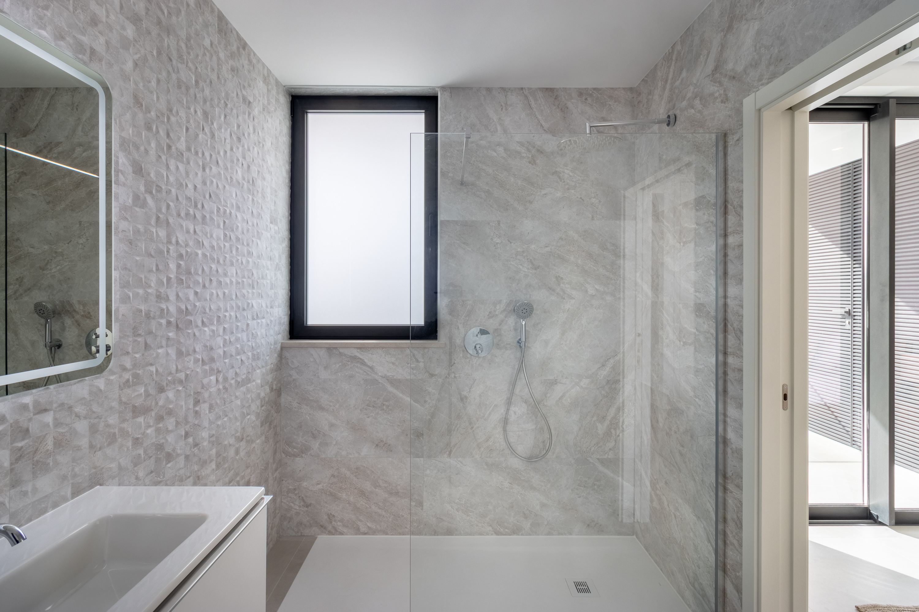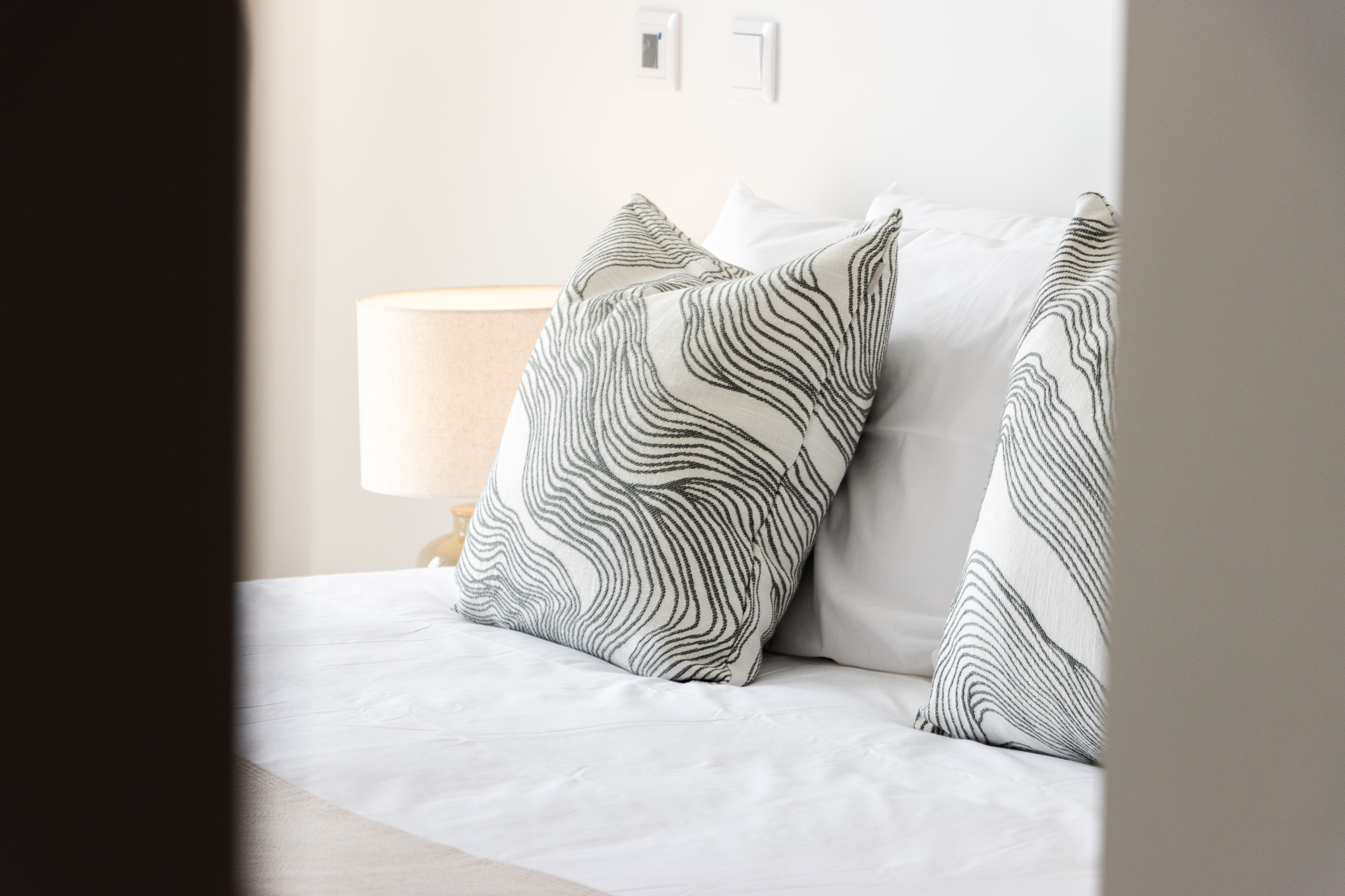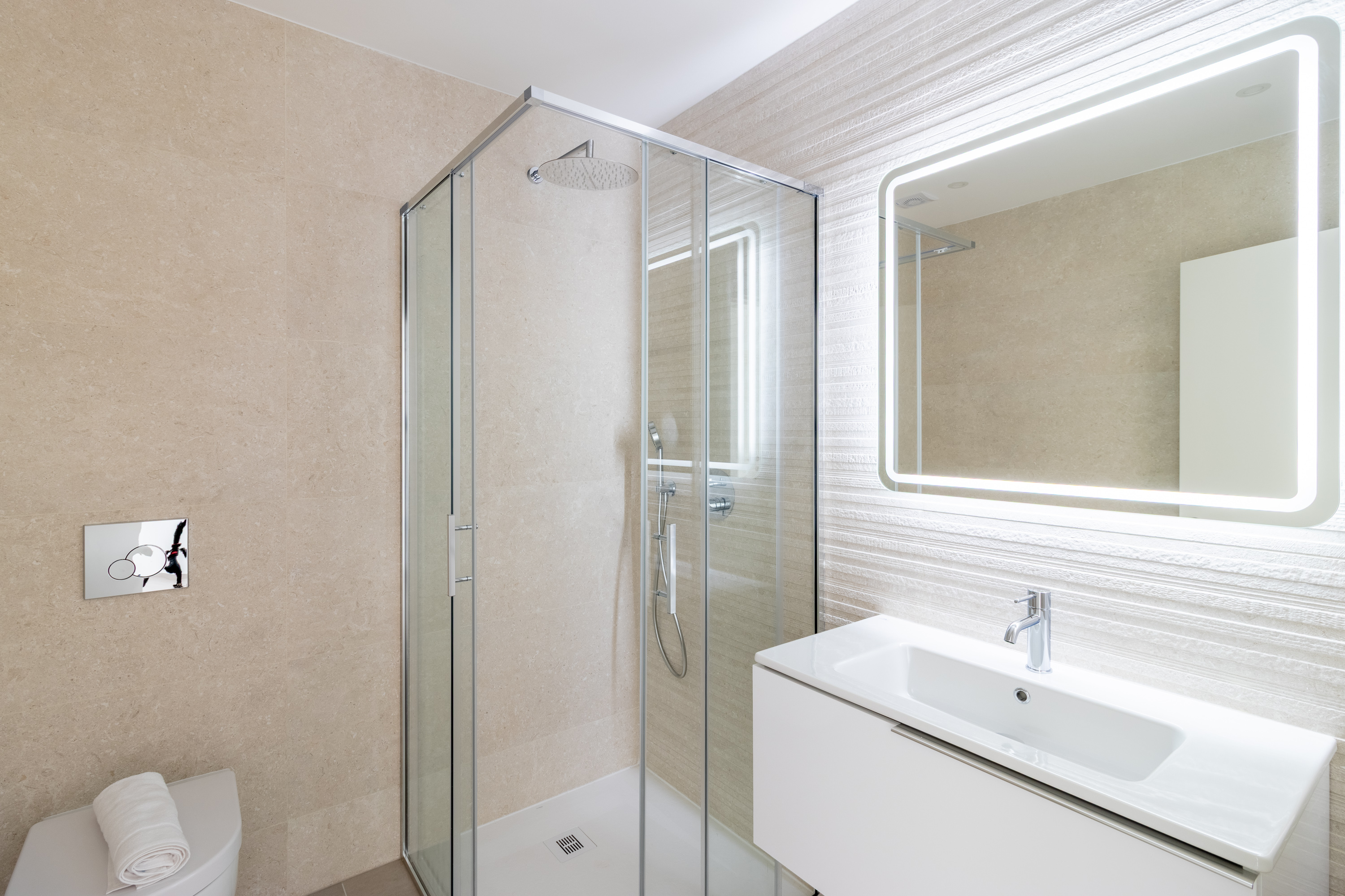 The apartment features three generously sized bedrooms, all designed with comfort and style in mind. The master suite, with a luxurious super king-size bed (180x200cm), enjoys direct access to the west-facing terrace, perfect for quiet evening moments. The second bedroom also offers a super king-size bed (180x200cm), its own private balcony with sea views and morning sun, and an en-suite bathroom. The twin bedroom (2x 90x200cm) is equally spacious and is served by a modern family bathroom.