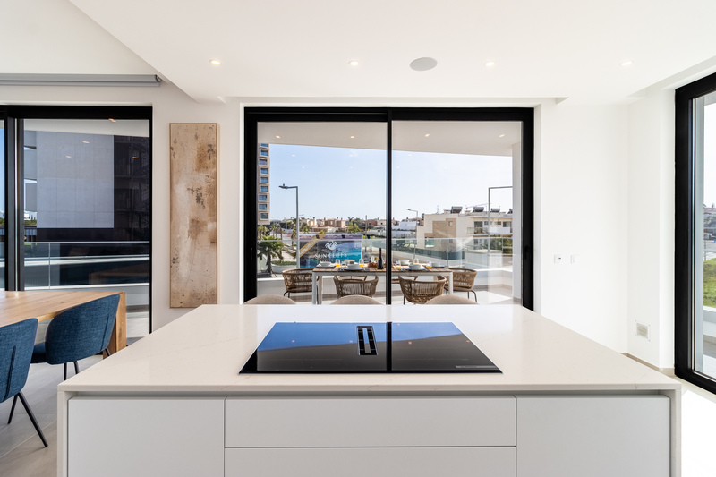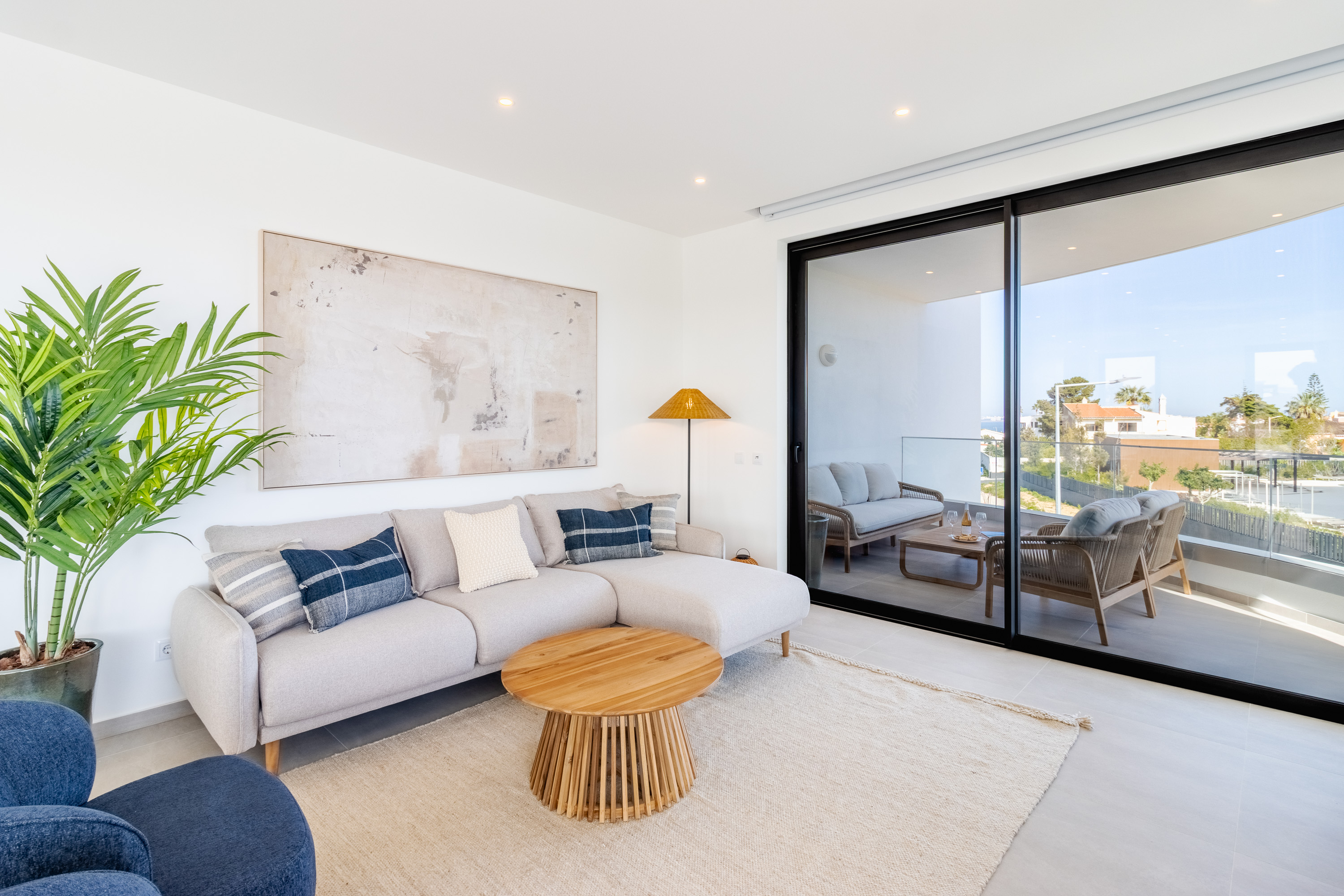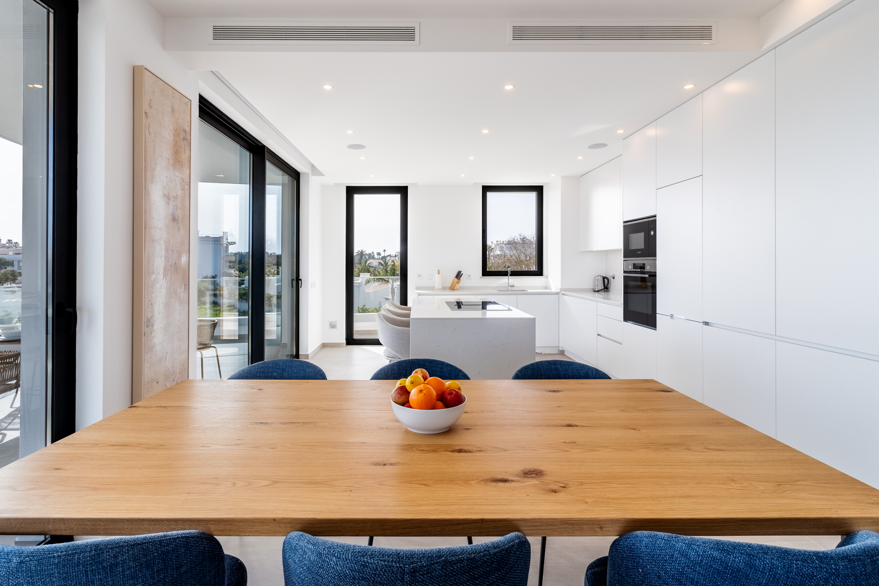 The elegant open-plan living, dining, and kitchen area opens onto a sea-view balcony facing east, perfect for enjoying your morning coffee as the sun rises over the coast. From here, you can also step onto a spacious wraparound terrace, where a dining area for six invites relaxed al-fresco meals in the warm southern and western sun.