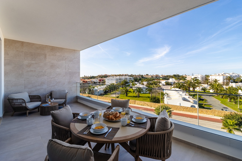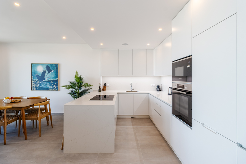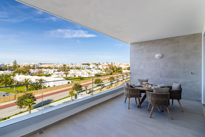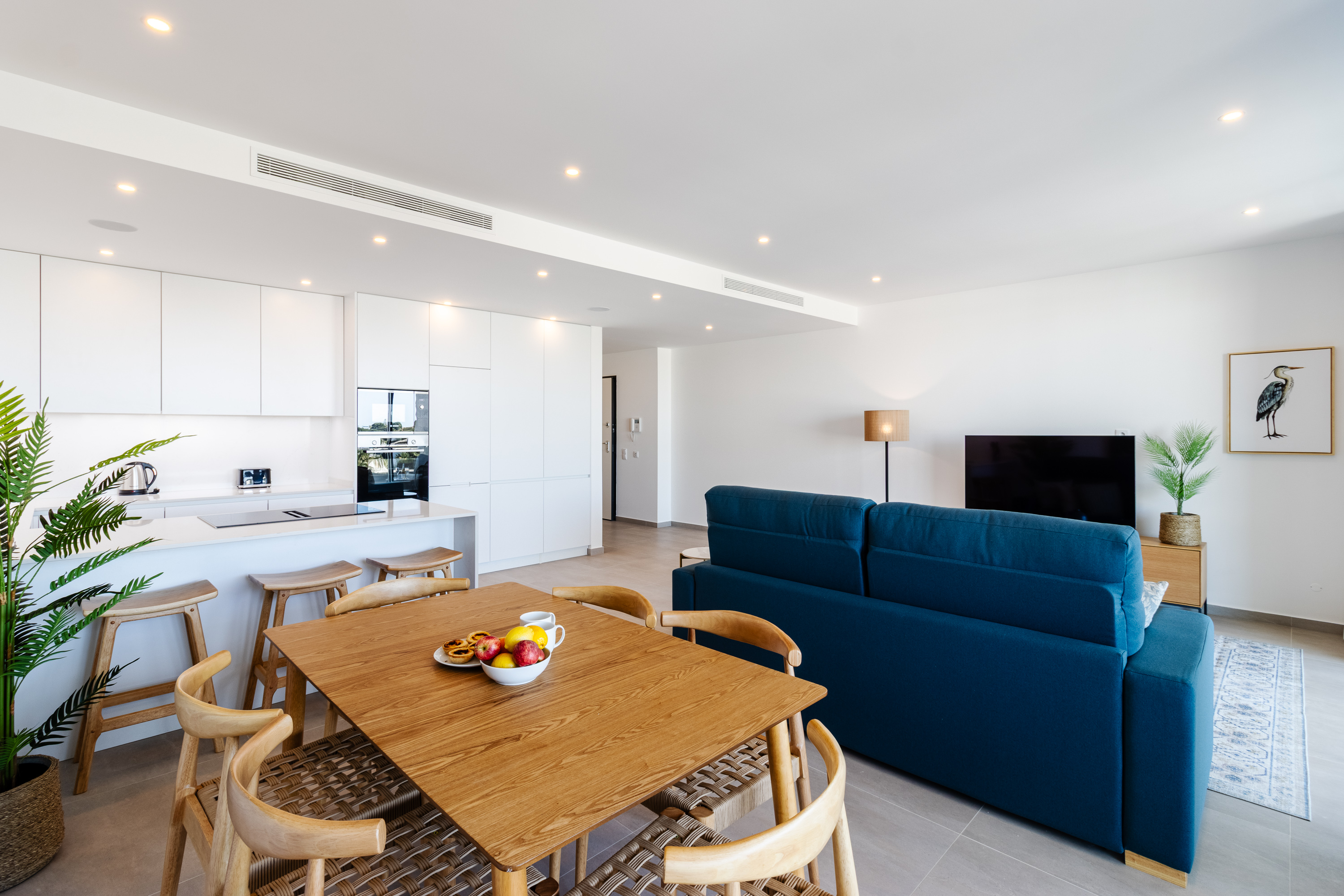 The modern kitchen is fully equipped with high-quality appliances and everything needed for preparing meals at home. Guests can enjoy dining indoors or make the most of the Algarve climate with al-fresco dining on the spacious terrace, complete with outdoor seating areas on both balconies.