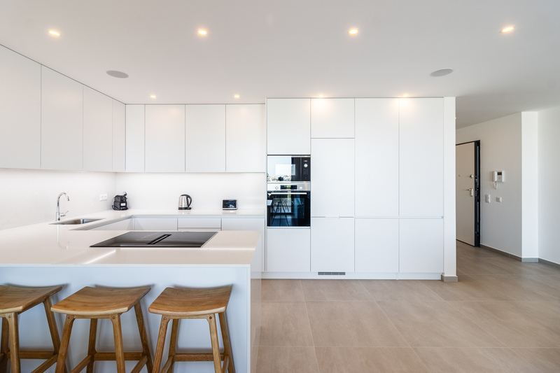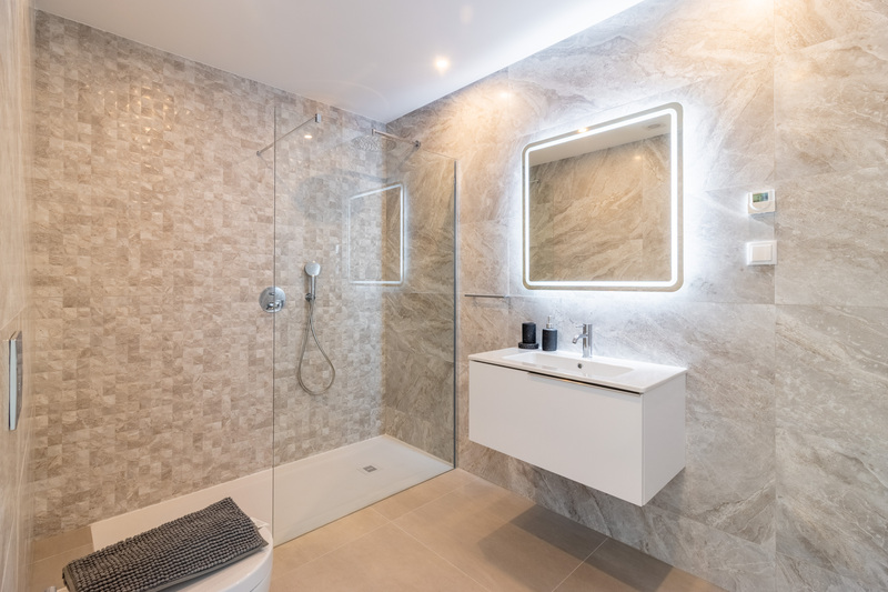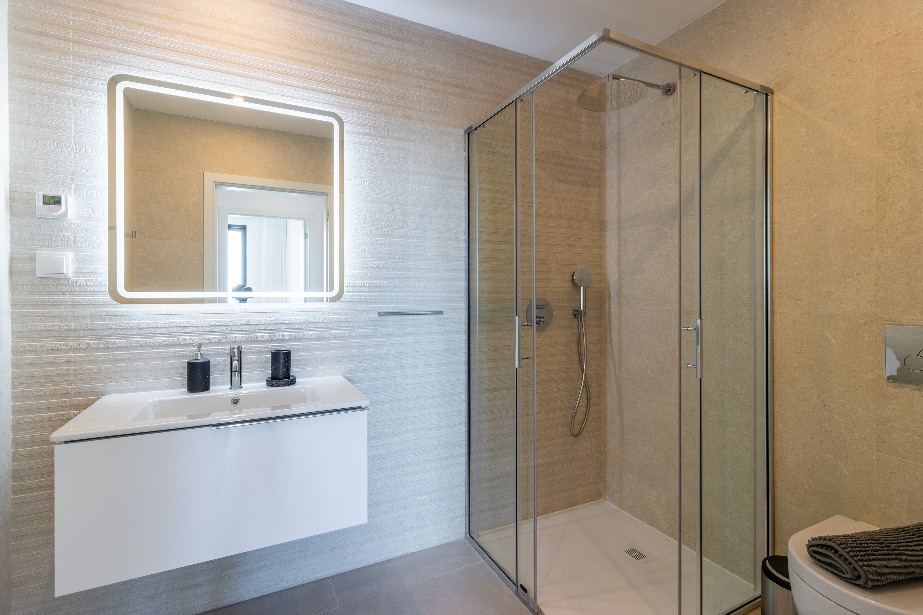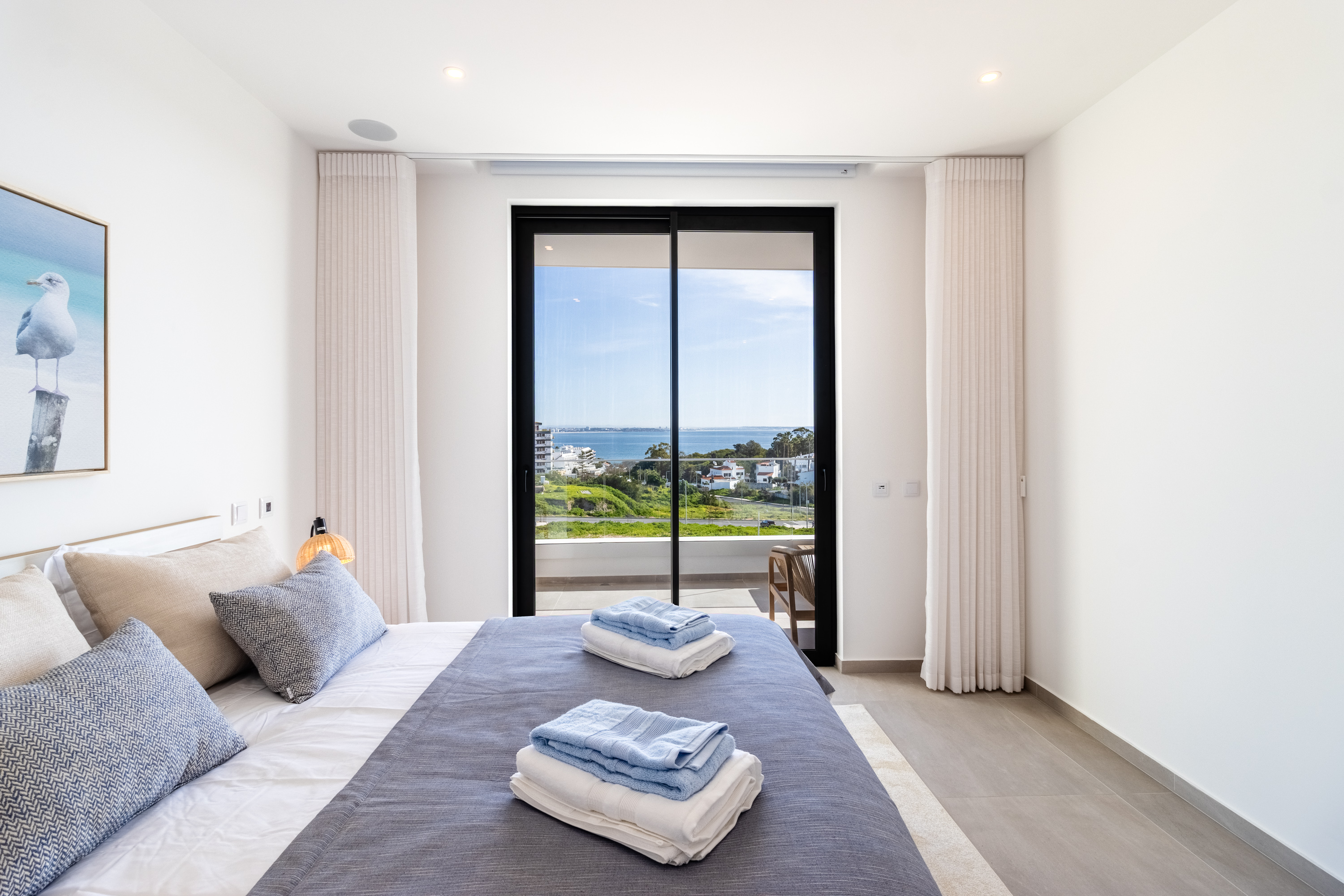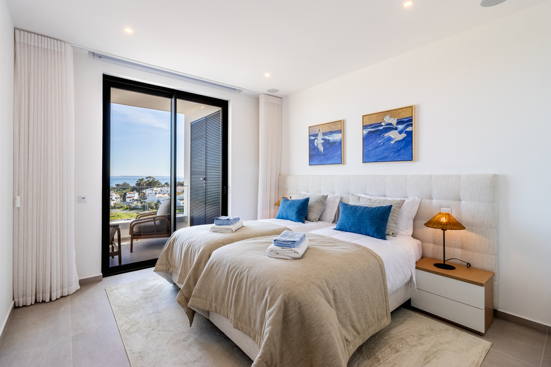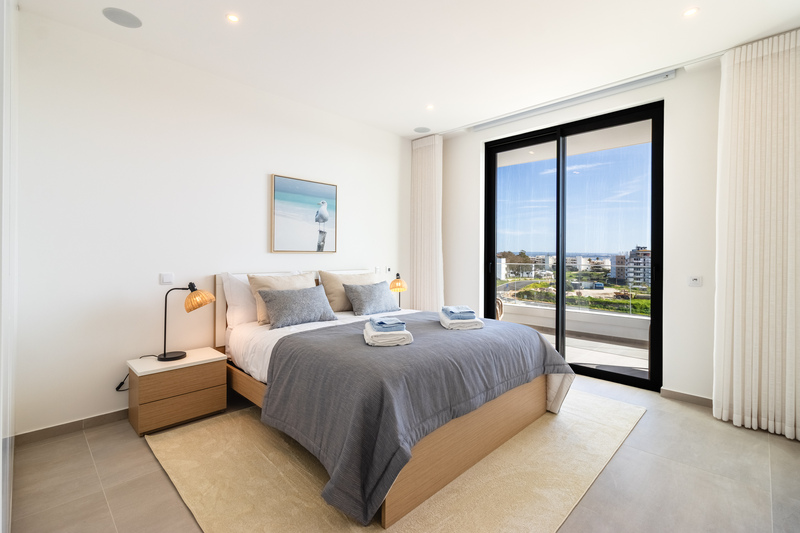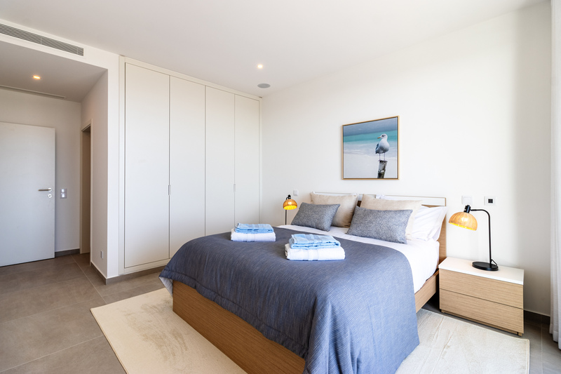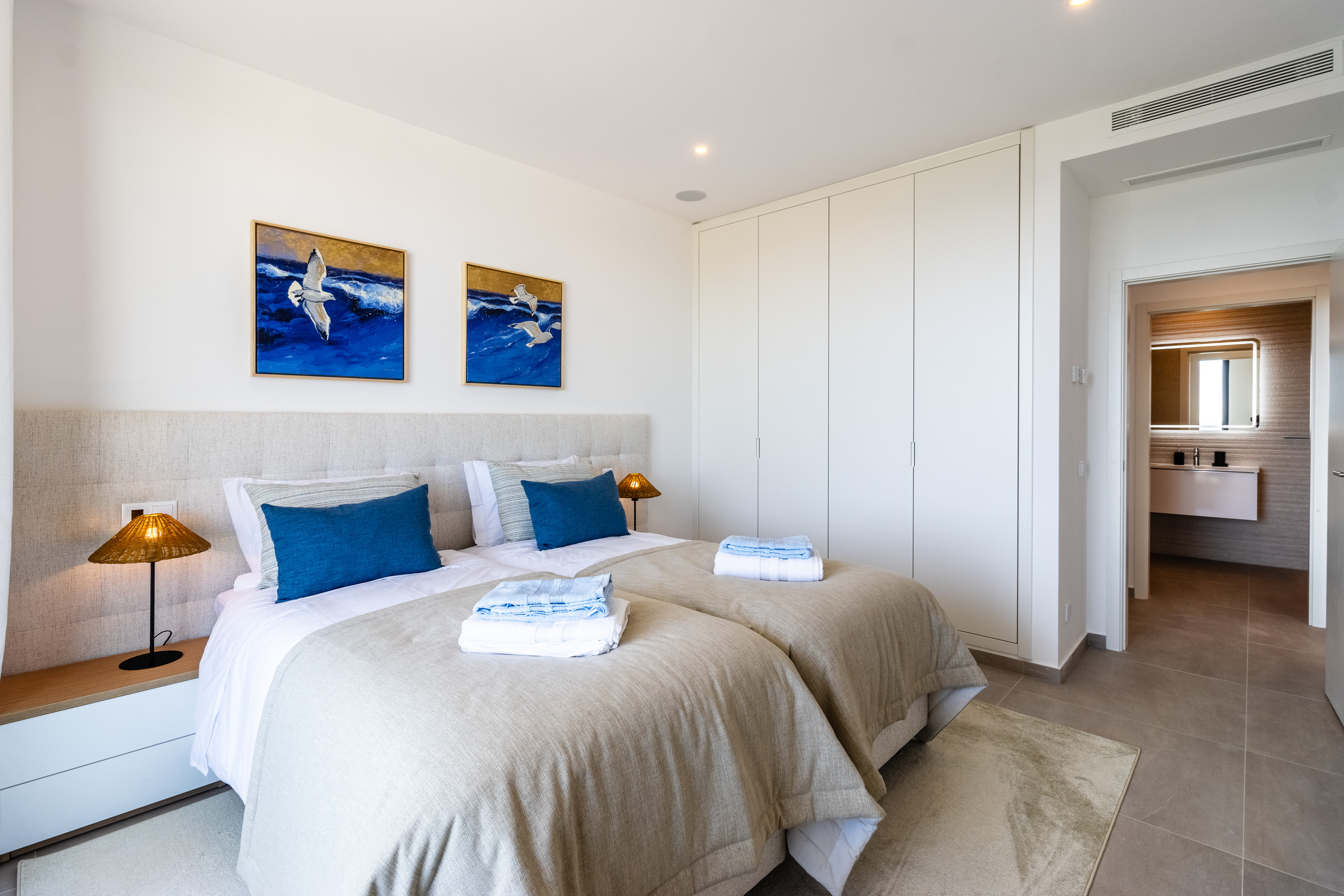 • The master bedroom features a king-size bed (160 × 200 cm), built-in wardrobes, darkening blinds and a sleek en-suite bathroom with walk-in shower. From here you also have direct access to the balcony, allowing you to wake up to beautiful sea views.