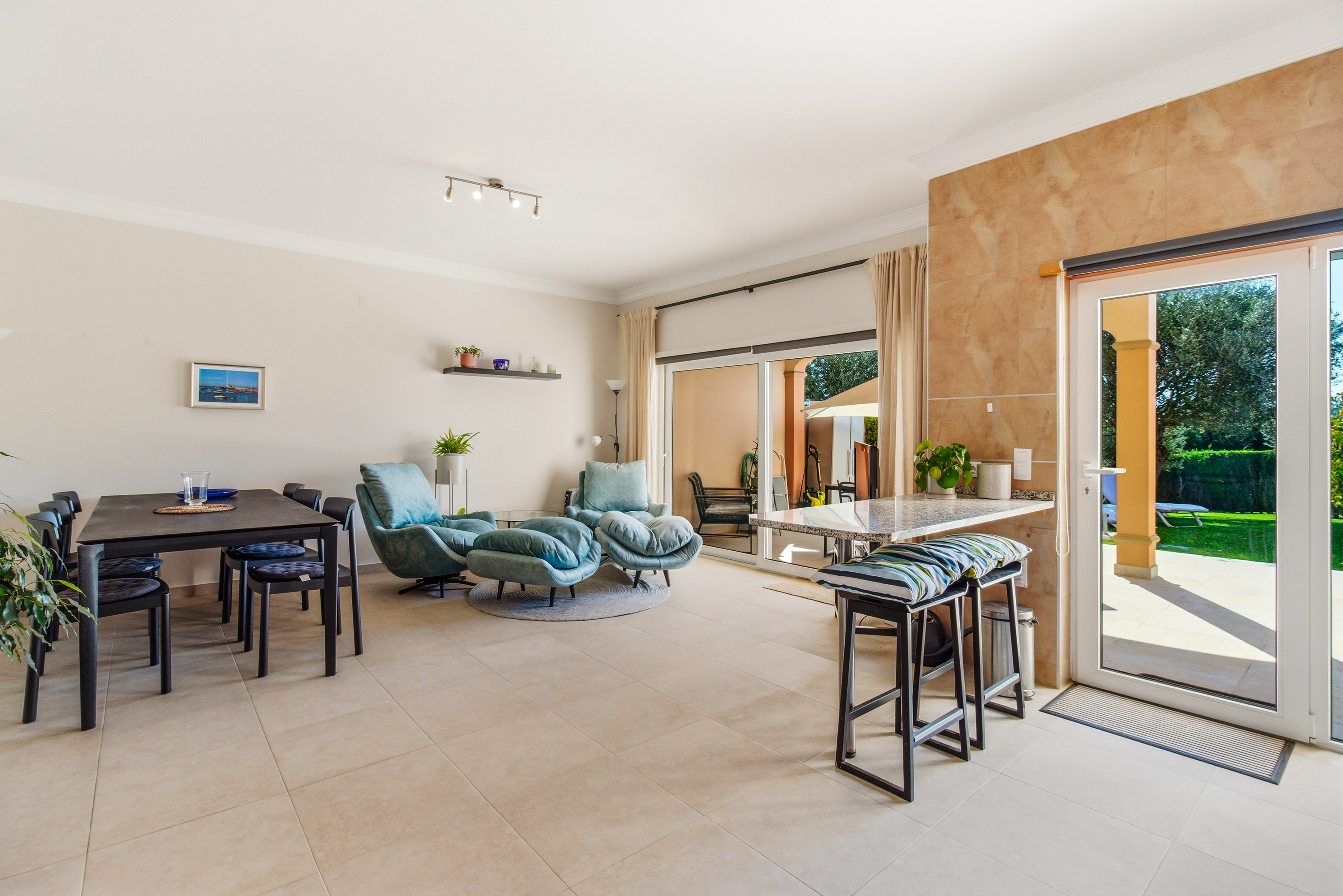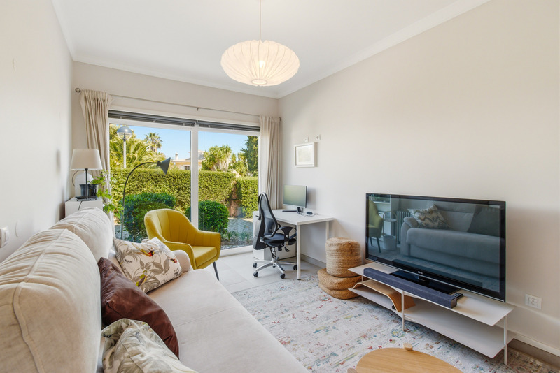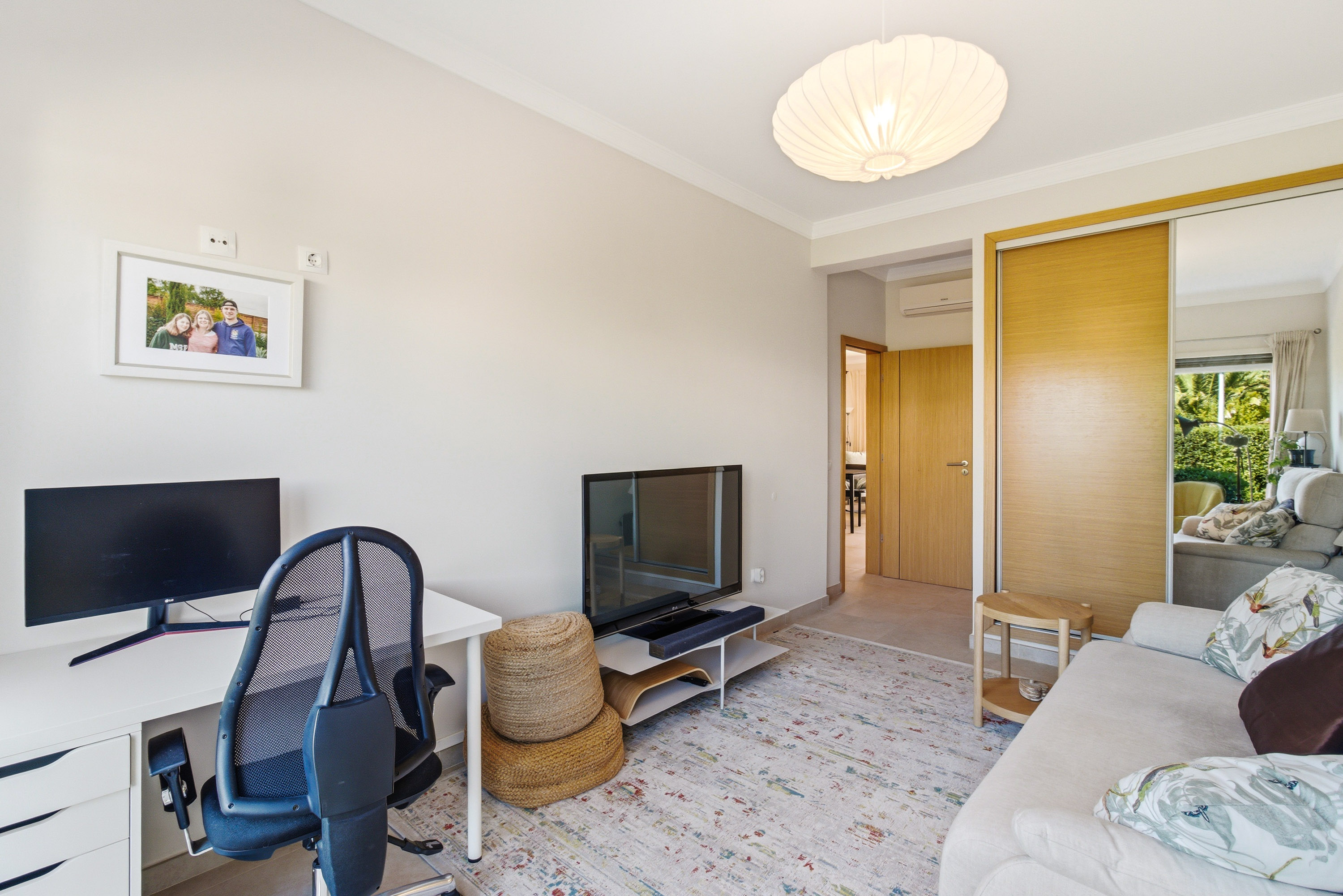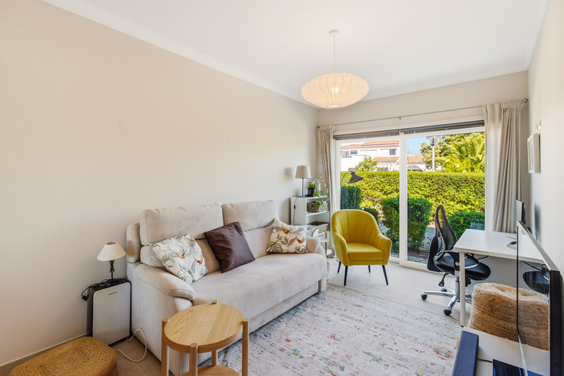 The ground floor offers a bright and comfortable living and dining area, with patio doors opening onto a spacious covered terrace complete with a BBQ area—ideal for outdoor dining and entertaining. The terrace leads directly to a private garden with easy access to the communal pool. Also on this level is a double bedroom set as an office, with an en-suite walk-in shower, as well as a guest WC.