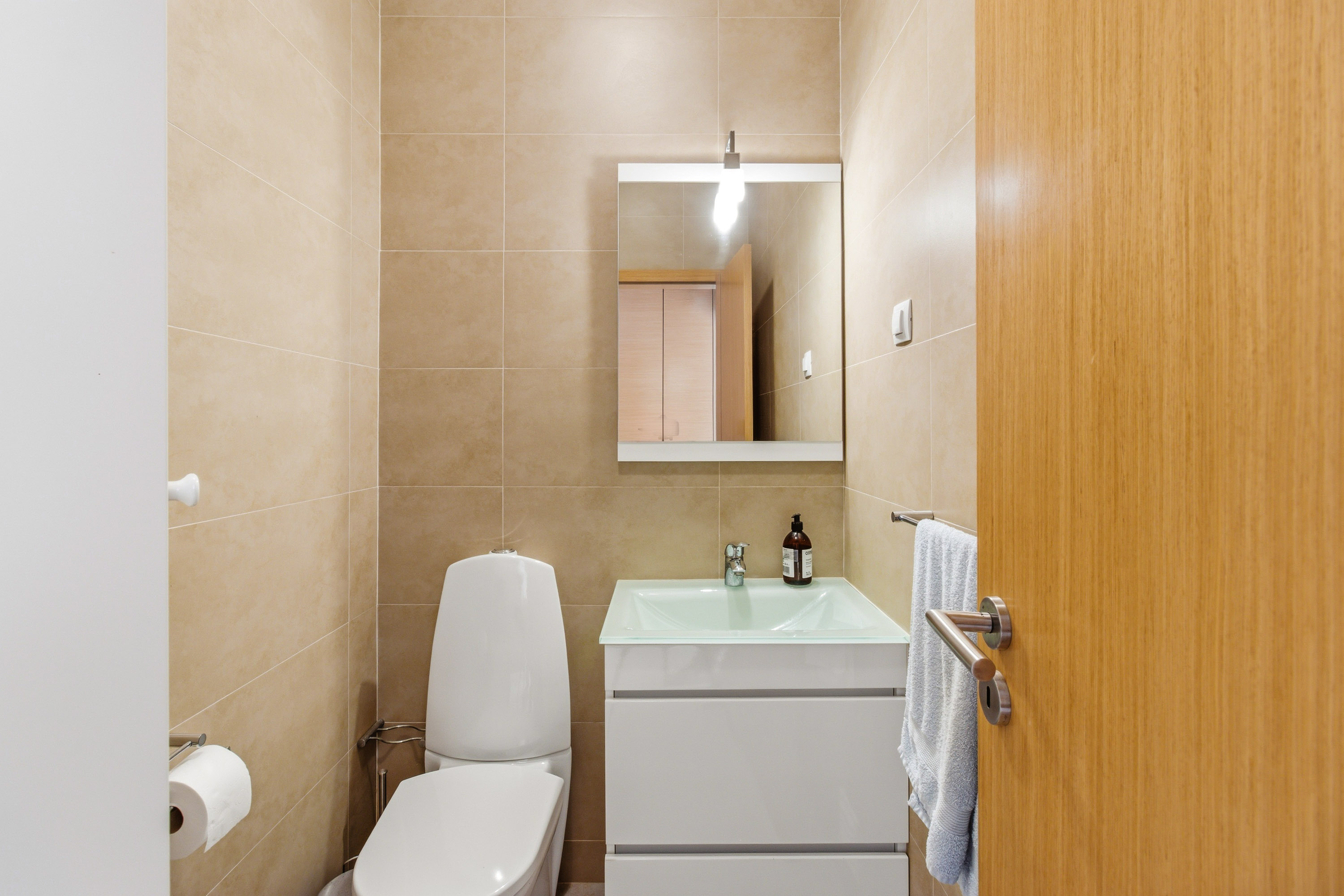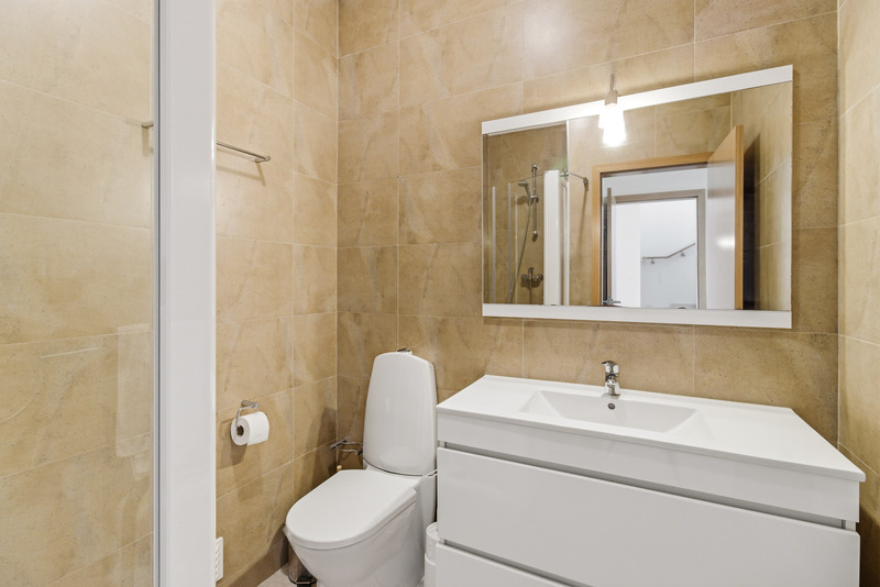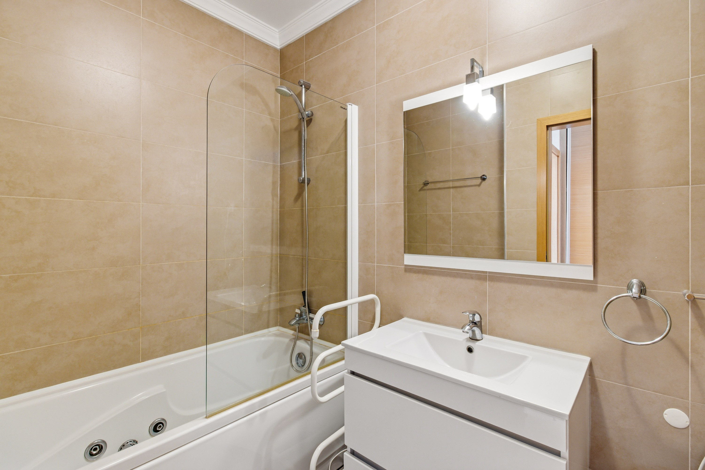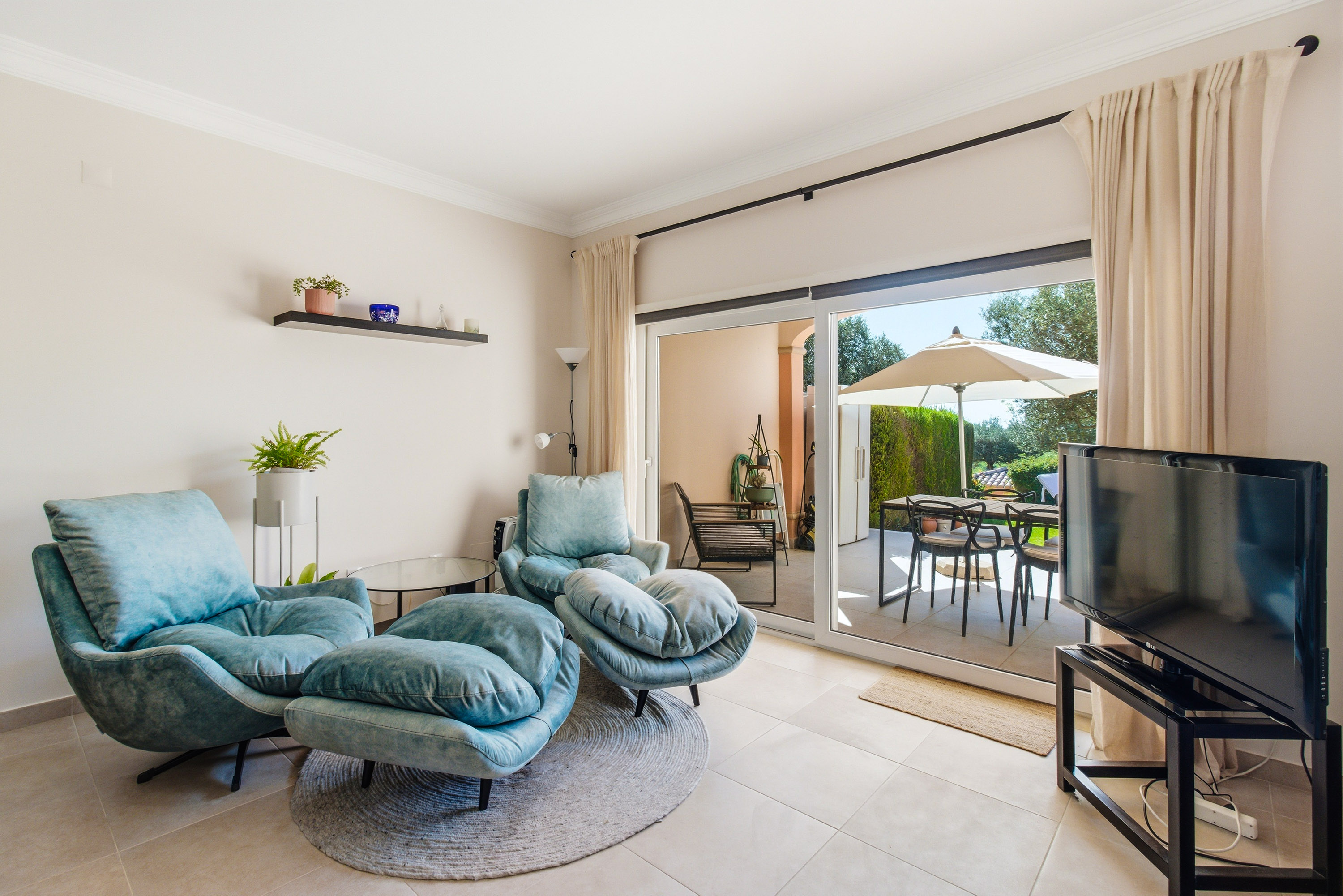 The ground floor offers a bright and comfortable living and dining area, with patio doors opening onto a spacious covered terrace complete with a BBQ area—ideal for outdoor dining and entertaining. The terrace leads directly to a private garden with easy access to the communal pool. Also on this level is a double bedroom set as an office, with an en-suite walk-in shower, as well as a guest WC.