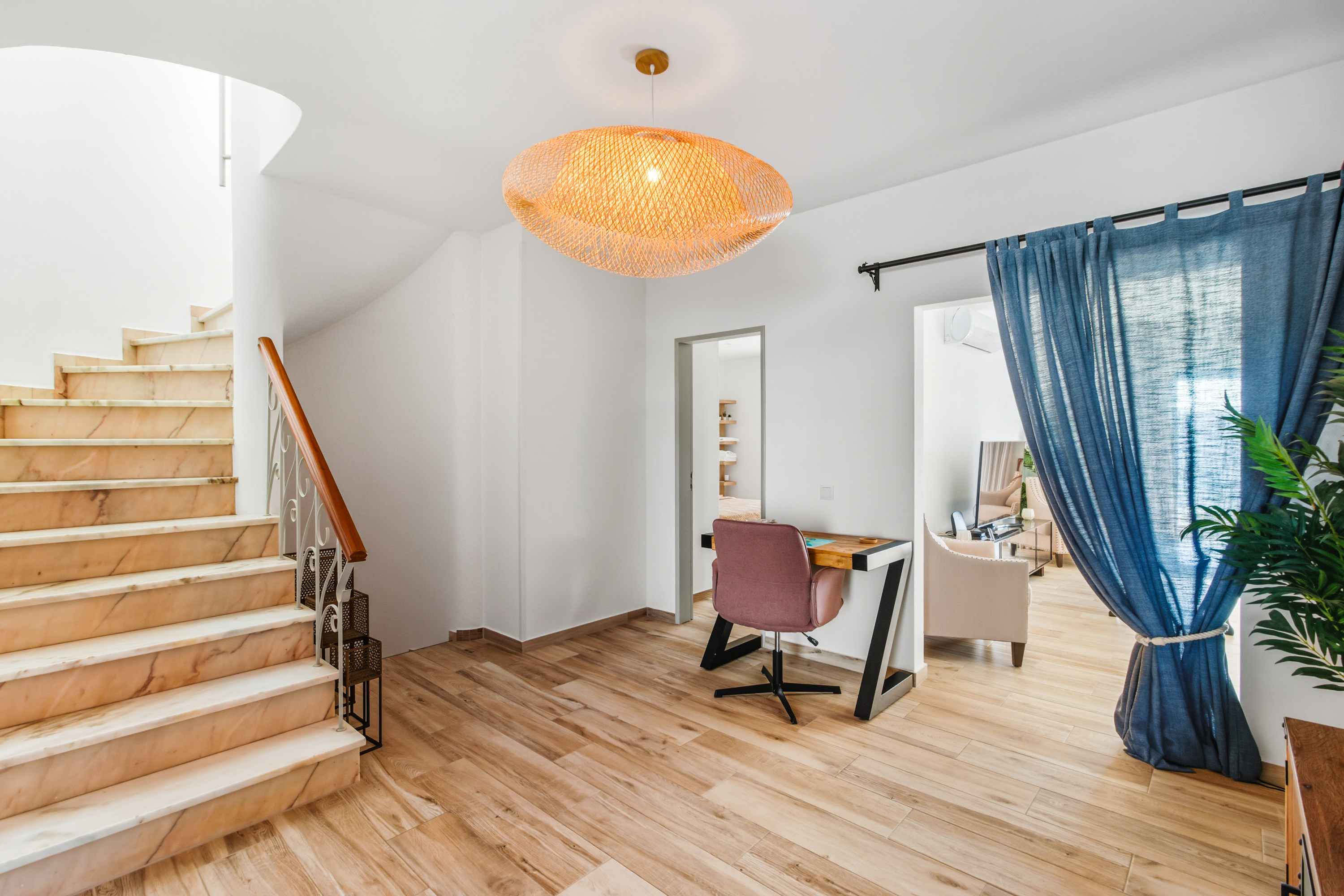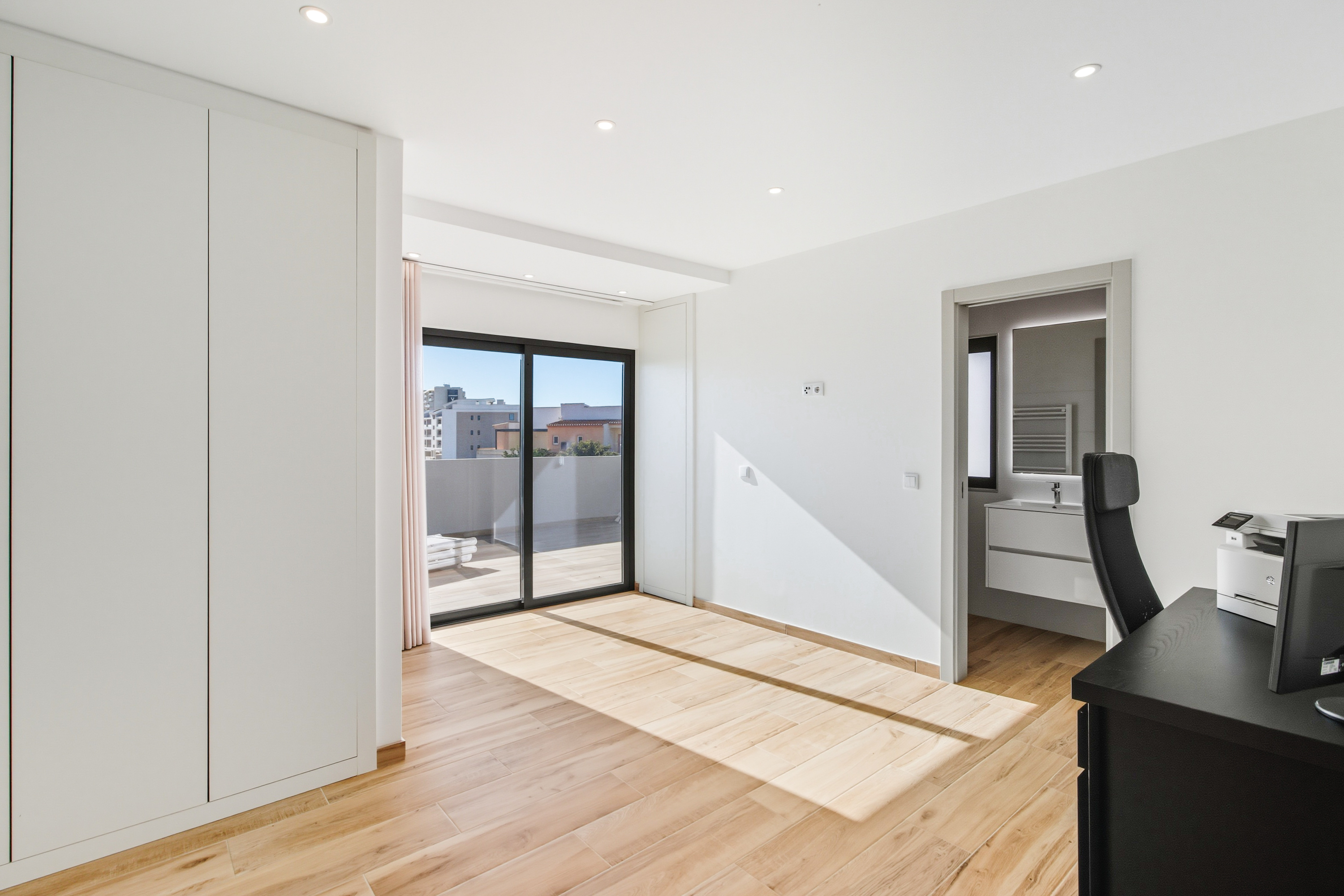 The upper floor hosts the fifth bedroom, featuring its own en-suite bathroom, an open space area, and access to a private terrace.