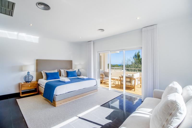 First Bedroom: Luxurious and spacious king-size double bedroom awaits, complete with a sofa and sliding doors that open onto the terrace with sea views and en-suite shower room.