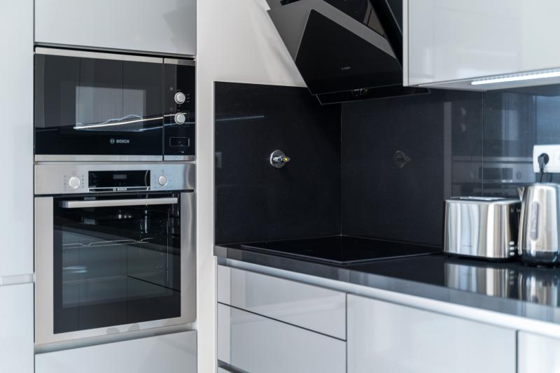 The sleek kitchen is fully equipped with a refrigerator, microwave, oven, freezer, washing machine, dishwasher, dishes, cutlery, kitchen utensils, and a kettle—everything you need for preparing home-cooked meals or a quick snack.